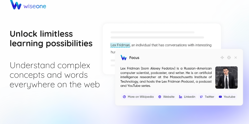 Wiseone introduces a new browser extension to optimize your reading & your exploration of information online. • Expand your knowledge. • Access factual information while browsing. • Receive sourced an