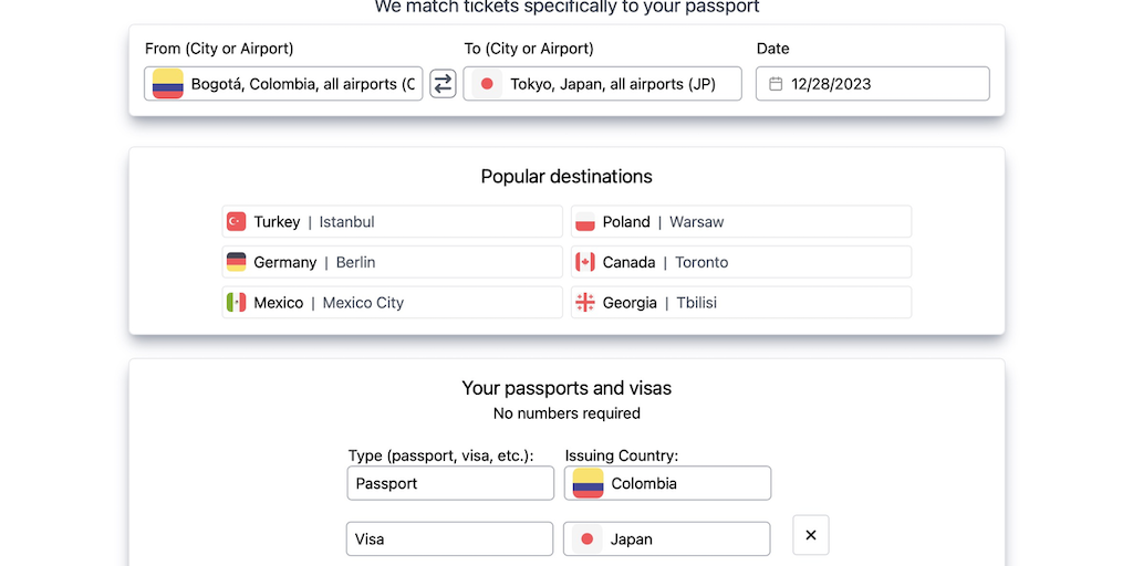 Passportal searches tickets based on passport and visa situation of a person. We show requirements and restrictions in detail, reducing the likelihood that user will not be allowed to board a flight a