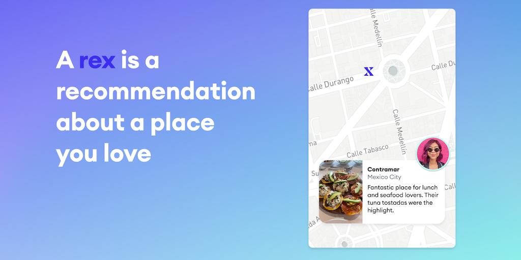 Rex simplifies the process of sharing place recommendations by mining our phone’s camera roll - using AI, the app identifies photos of restaurants, bars, hotels etc., and turns them into “rex” that yo
