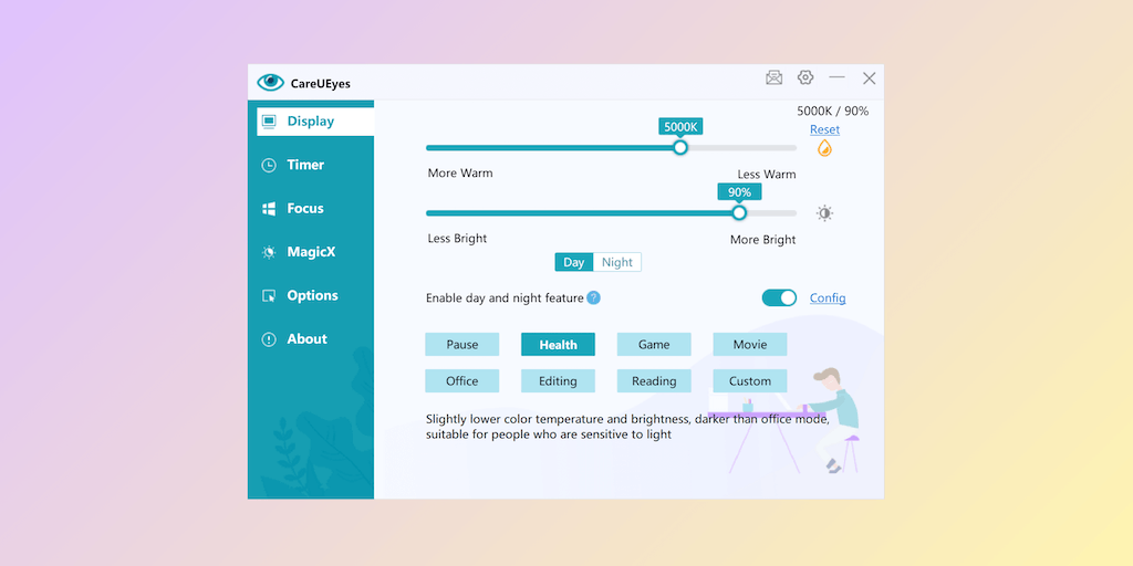 CareUEyes is a multi-functional eye protection software. It can adjust brightness and color temperature, automatically darken windows, and provide timed reminders to encourage users to take breaks and