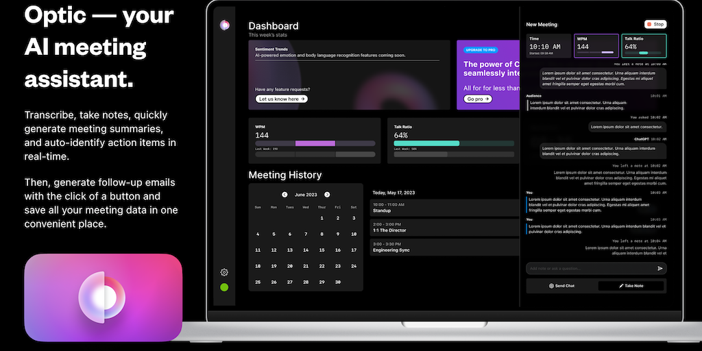 Optic transcribes video calls in realtime and creates AI-generated meeting summaries with action items. Optic's ChatGPT integration lets you ask anything from your desktop. Optic also keeps track of h