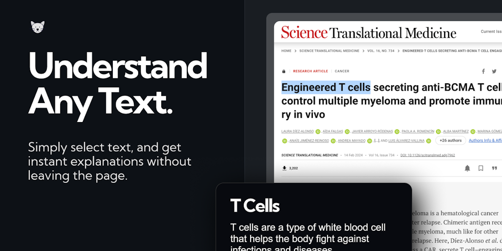 Boost your reading with real-time explanations! Select any text you don't understand, and get instant explanations without leaving the page. Perfect for academic papers, coding & documentation, and fi