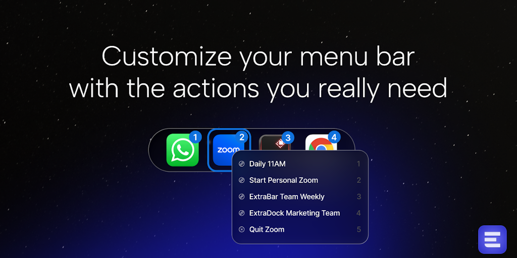 ExtraBar transforms your macOS menu bar into a customizable command center. Jump to Zoom meetings, Slack channels, VS Code projects, or Figma files instantly. Deep link into apps, run scripts, trigger