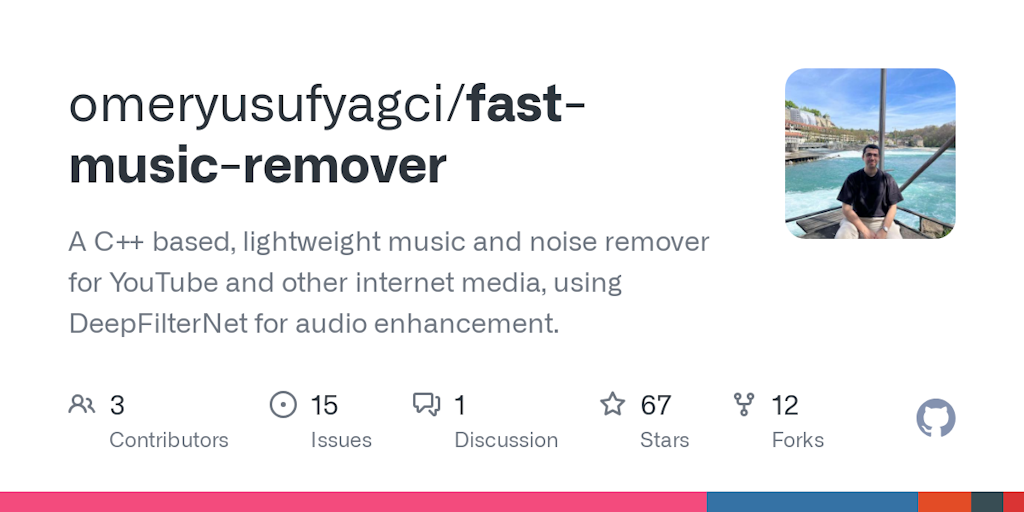 A free and open-source, lightweight music and noise remover for internet media, powered by DeepFilterNet for audio enhancement. A minute-long video is processed in less than 5 seconds! Watch the demo