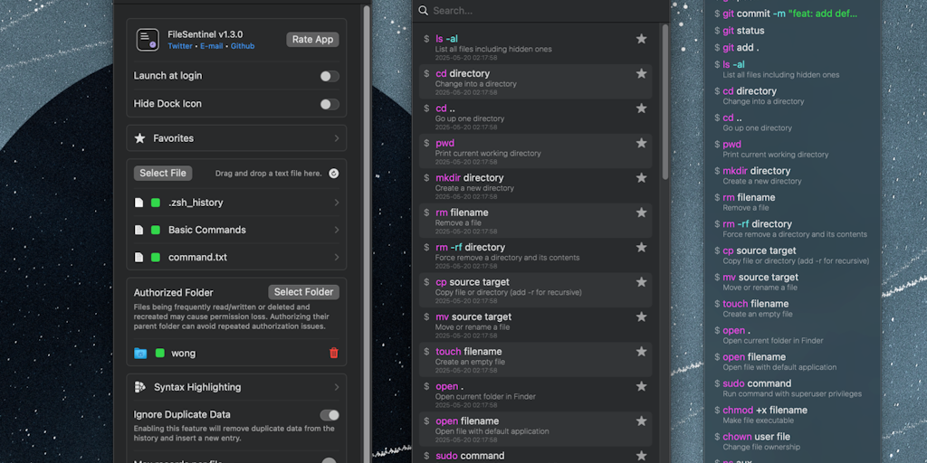 File Monitor watches text files likezsh_history orbash_history, automatically saving the latest command lines so you can quickly search and never forget your terminal history.