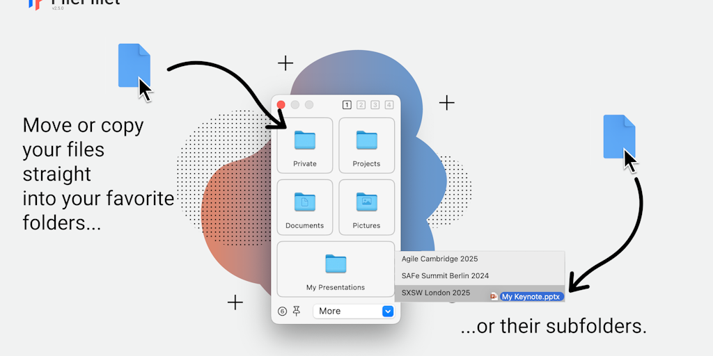 FileFillet helps you to copy or move files to your favorite folders. Keep the overview by not having to open new Finder windows anymore.