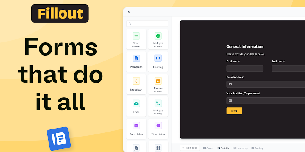 Fillout is the form builder that does it all. Free forms, scheduling, PDF generation, payments & workflows, all in one easy-to-use product.