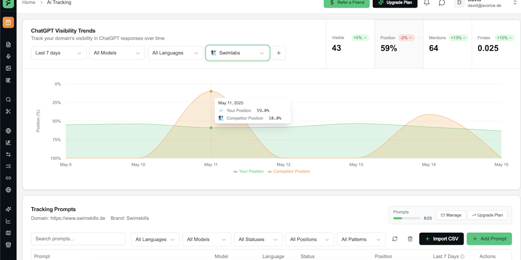 Monitor your visibility across AI engines like ChatGPT, Perplexity, DeepSeek, Claude & Gemini. See daily mentions of your brand, domain, and compare with competitors. Every prompt is tracked—stay ahea