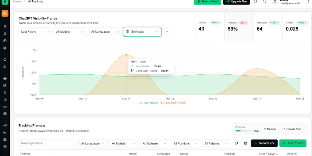 Monitor your visibility across AI engines like ChatGPT, Perplexity, DeepSeek, Claude & Gemini. See daily mentions of your brand, domain, and compare with competitors. Every prompt is tracked—stay ahea