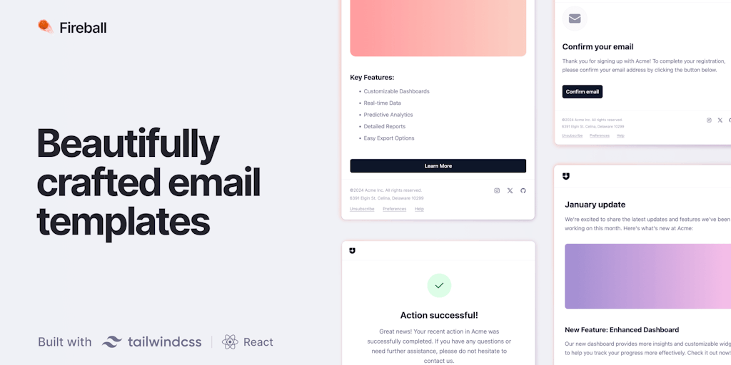 Fireball is a collection of simple, modern email templates designed for SaaS products and marketing flows. The templates are built using React Email and TailwindCSS and are designed to be clear, versa