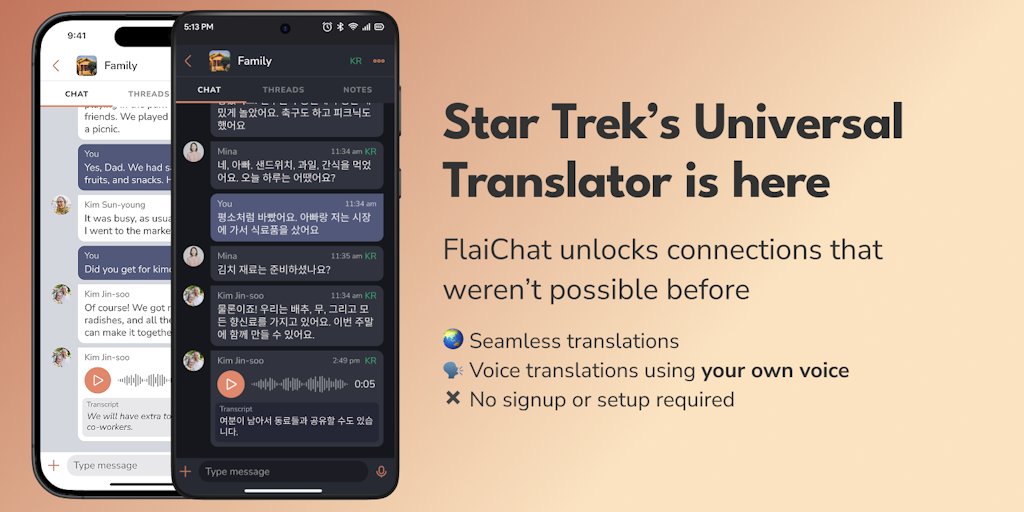 Imagine if language barriers didn't exist. FlaiChat makes that happen with zero setup required! Seamless translations make convos flow. FOR FREE! 🔈 We're excited to announce Voice Translations, where