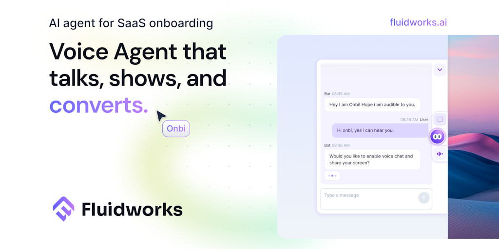 Fluidworks is an AI onboarding agent that lives inside each user’s session in your web app, guiding them in real time with voice and clicks. No more static tours. Just smart, personalized onboarding
