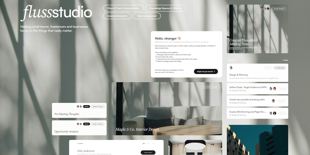 fluss.studio is a project management app helping you spend less time juggling tools and more time doing what you love. Bringing together client communication, task tracking, invoicing and knowledge sp