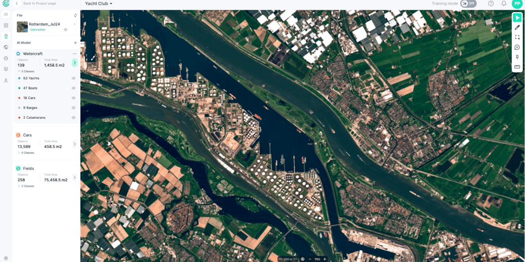 Create AI use cases with Aerial and Satellite Imagery: detect objects and segment land on earth observation data. NO knowledge about AI or Machine Learning is required.