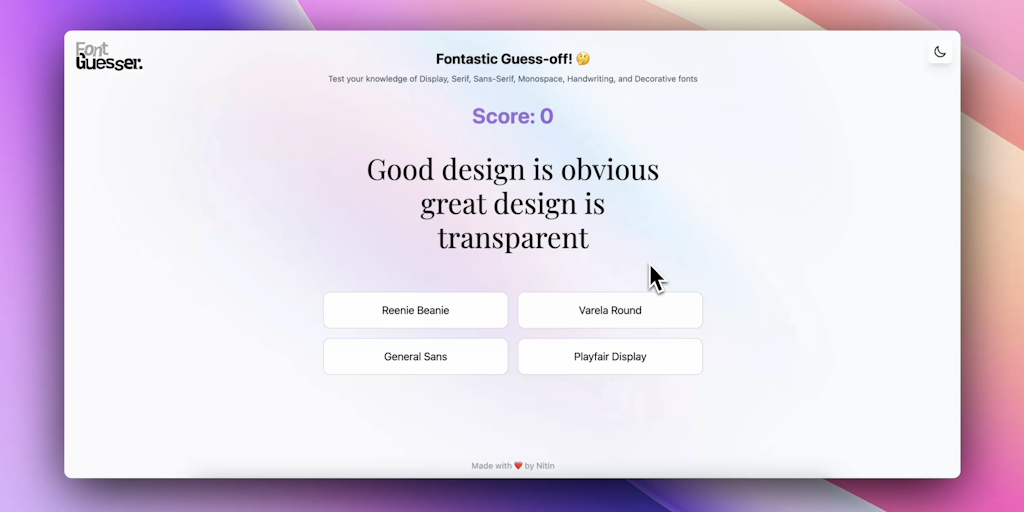 Test your knowledge of Display, Serif, Sans-Serif, Monospace, Handwriting, and Decorative fonts. Built using Cursor AI and Tailwind CSS.