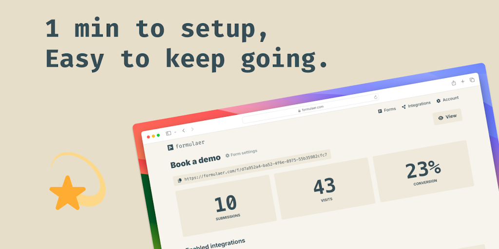Tired of complex form builders and insane, makes-no-sense user limits? Give Formulaer a try instead. Create simple, clean forms with minimal effort, for free. Formulaer is an easy way to setup forms f