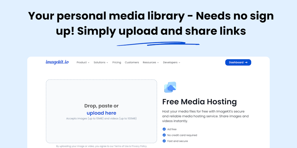 Free Media Hosting by ImageKit - Securely upload images and videos + Share links instantly | Product Hunt