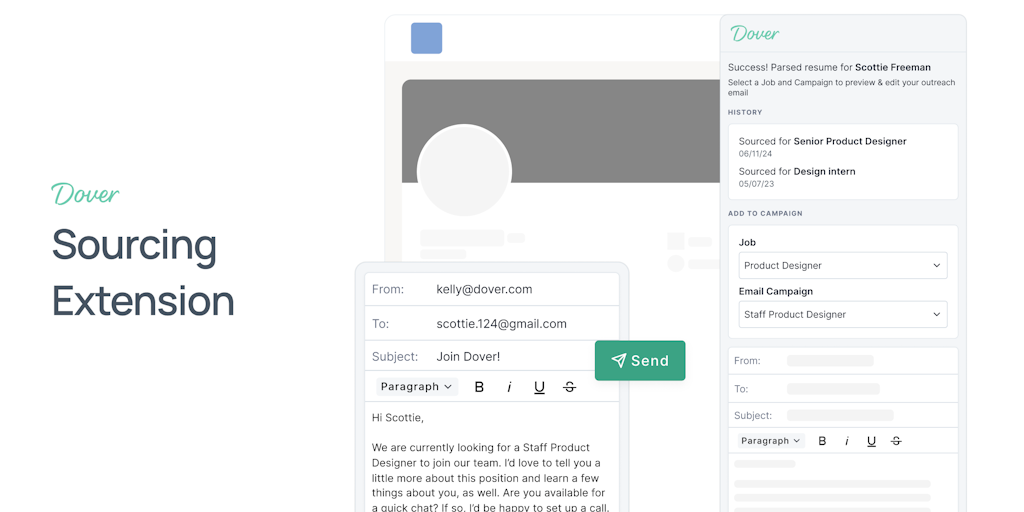 The simplest way to source candidates from LinkedIn. Completely free, no premium tier. Find emails and send personalized outreach in one click. Part of Dover's complete platform for startup hiring.