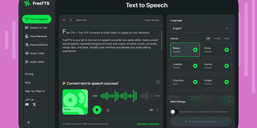 FreeTTS is your go-to TTS converter and audio editor. Easily convert text to speech, separate vocals from background music, enhance voice quality, cut audios, merge multiple clips, and more. Simplify