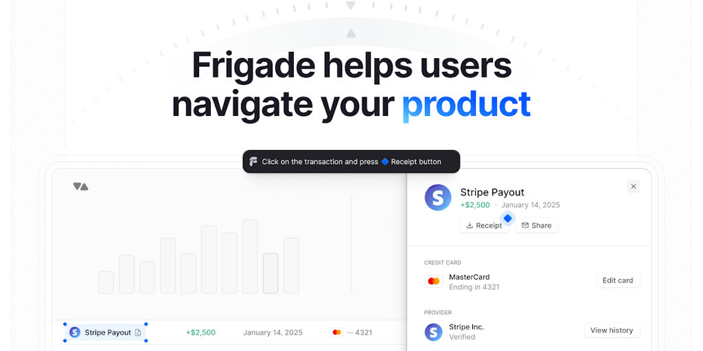 Frigade AI is an in-app agent that guides users, answers questions, and takes action, right inside your UI. It learns your product by using it, updates itself as you ship, and delivers personalized, r