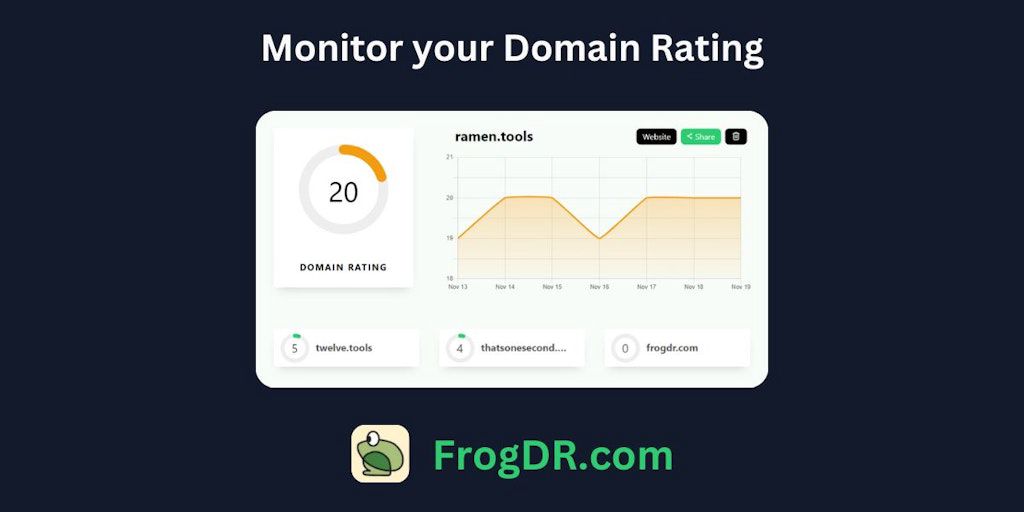 FrogDR is a tiny website that automatically tracks your DR (Domain Rating) everyday. It also helps you increase your website's domain authority and SEO by giving you some tasks and backlinks opportuni