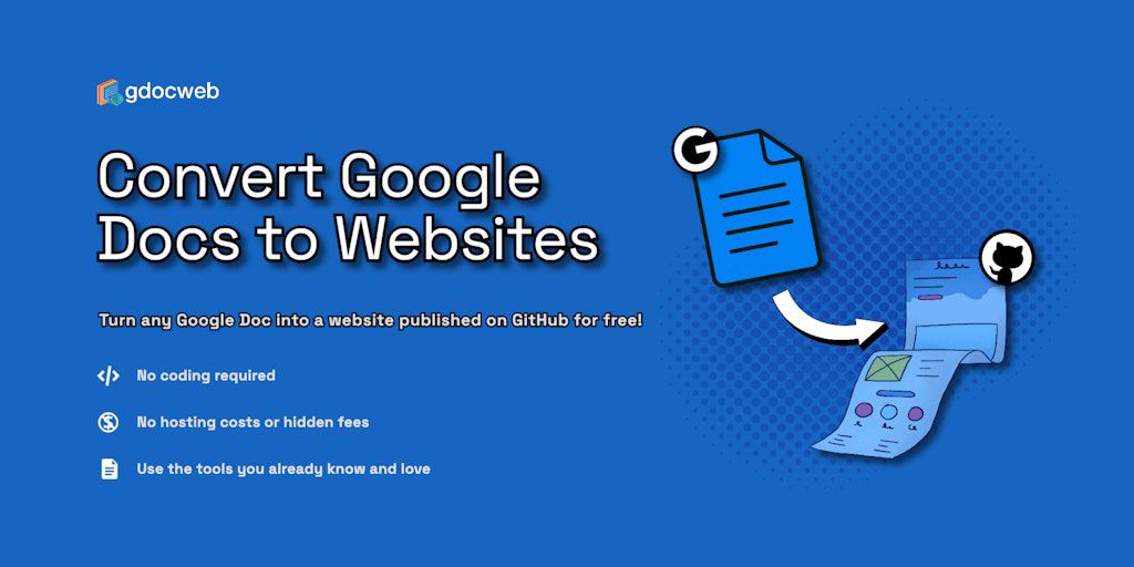 gdocweb converts Google Docs into websites hosted on GitHub with just a few clicks. Turn any Google Doc into a website published on GitHub pages for free. No coding required, no hosting costs or hidde