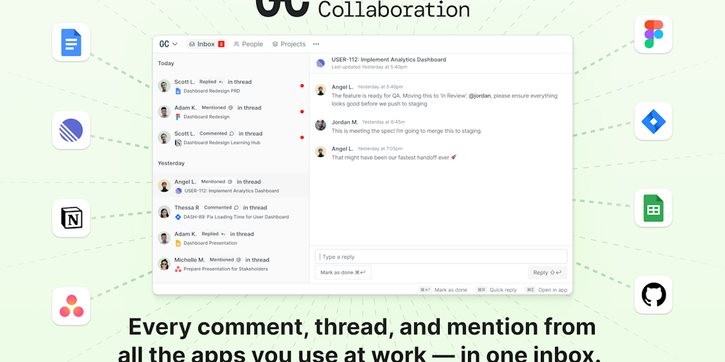 GC works inside and across all the apps you use at work to find comments that need your attention, magically create a “single source of truth” for each project you’re working on, and helps you easily