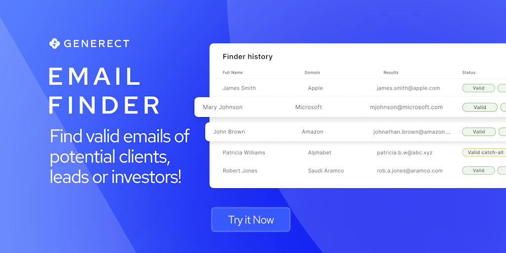 Generect Email Finder discovers and validates emails with 98% accuracy. Reduce risk to 10% with unique catch-all validation. Upload and verify lists in bulk and integrate via API. Optimize your outrea