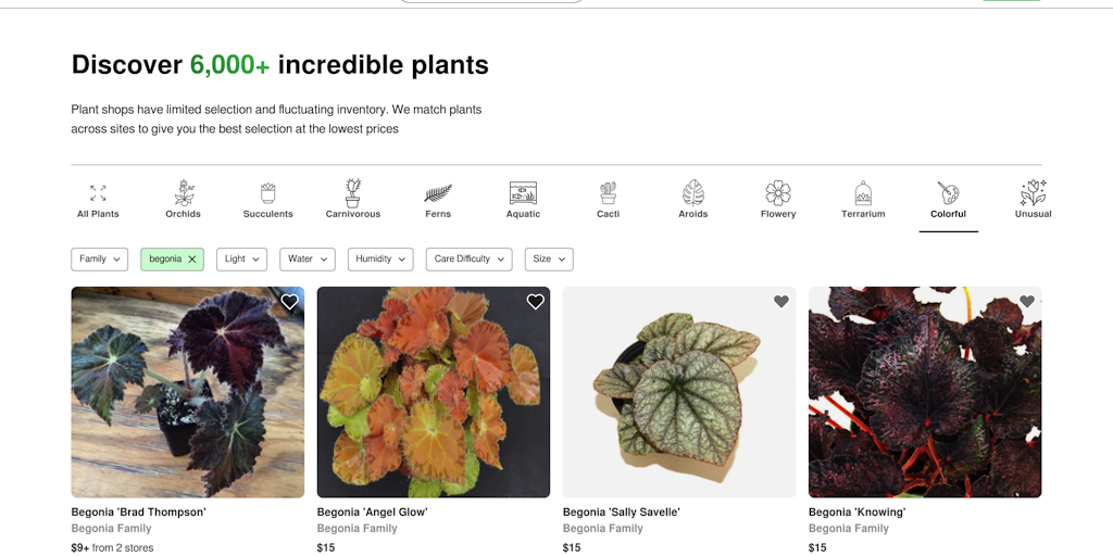 We match thousands of plants from across stores and organize them with descriptions, care data, and up-to-date availability. We also provide categories and filters to find new plants that match your n