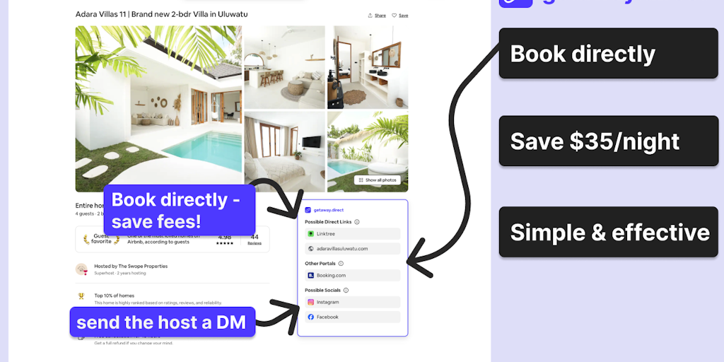 Skip Airbnb’s fees and save up to 20% per night! Finds direct booking links, helping you connect with hosts and avoid fees. Book smarter, save more.