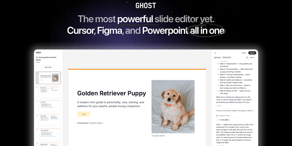 Ghost is a GPU-powered, AI-native slide editor that feels as easy as Figma. Built for speed, everything runs smoothly. With Ghost AI, generate anything—every change stays fully editable: move, tweak,