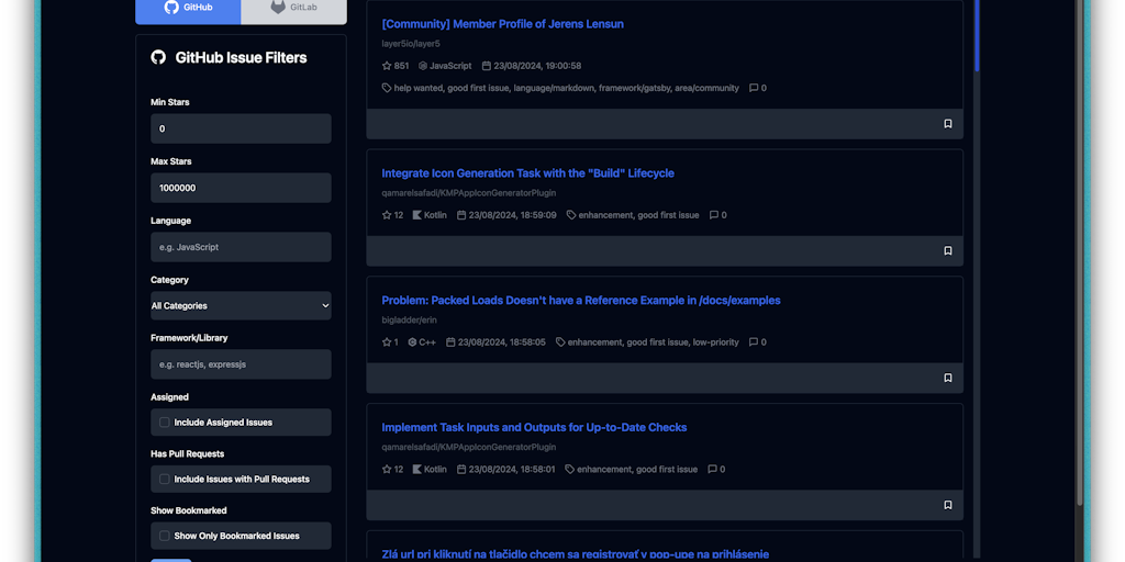 Git Begin: A web app to find & track your first open-source contributions. Filter GitHub's "good first issues" by language, stars and categories like Web Dev, ML, DevOps. Bookmark interesting issues.