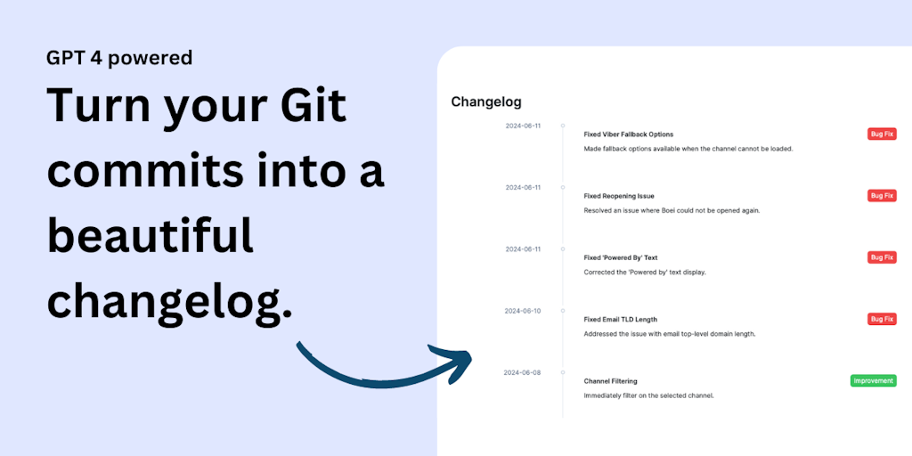 This free tool takes your git commits and transforms them into a beautiful, customer friendly changelog. Keep your users informed about the latest updates and improvements effortlessly. Make a changel