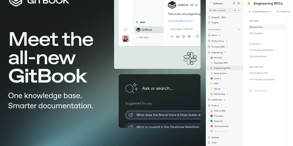GitBook began in mid-2014 as an open-source tool for developers to build documentation. Today it gives teams the tools to create create beautiful, AI-optimized docs that automatically adapt to your us
