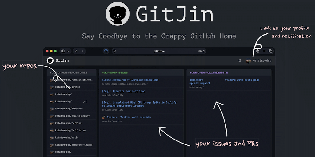 GitJin: GitHub repos, issues, and PRs in one clear dashboard | Product Hunt