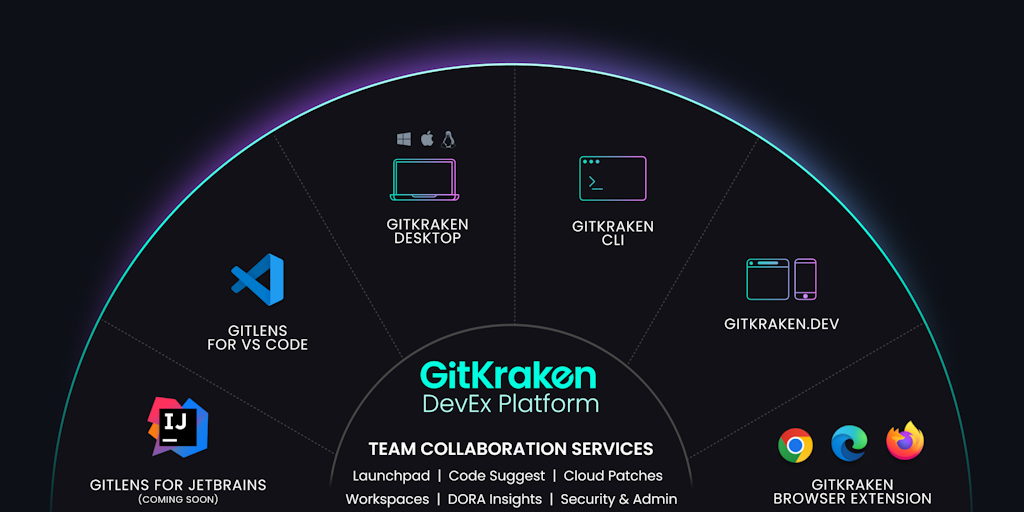 GitKraken's DevEx platform combines all of our essential dev tools—like GitLens and our leading Git GUI—with powerful collaboration features to create a seamlessly connected experience across desktop,