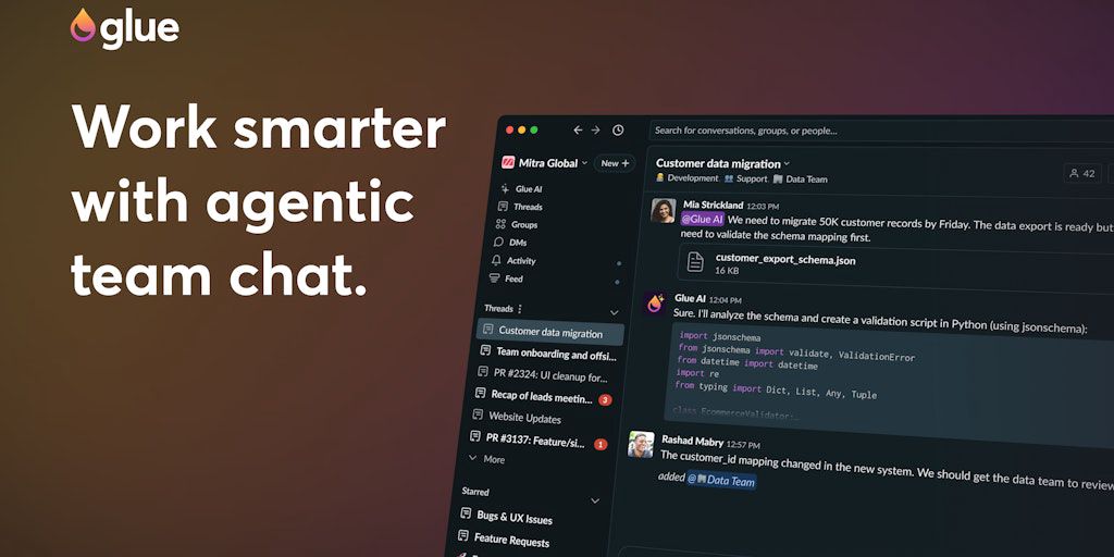 Glue is the first platform for agentic team chat, where humans, their tools, and AI collaborate side by side. With native AI, goal-oriented threads, and MCP-powered workflows, teams can cut noise and