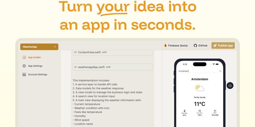 Build native iOS and Android apps by just chatting. Turn your ideas into apps in seconds. Connect APIs with just a few prompts, create MVPs in minutes instead of days or design apps together with your