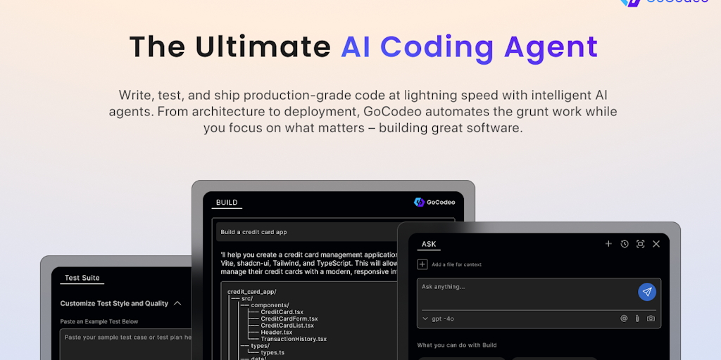 GoCodeo is the ultimate AI coding agent for developers. Write, test and ship production-grade code at lightning speed with GoCodeo. From architecture to deployment, our AI automates the grunt work whi