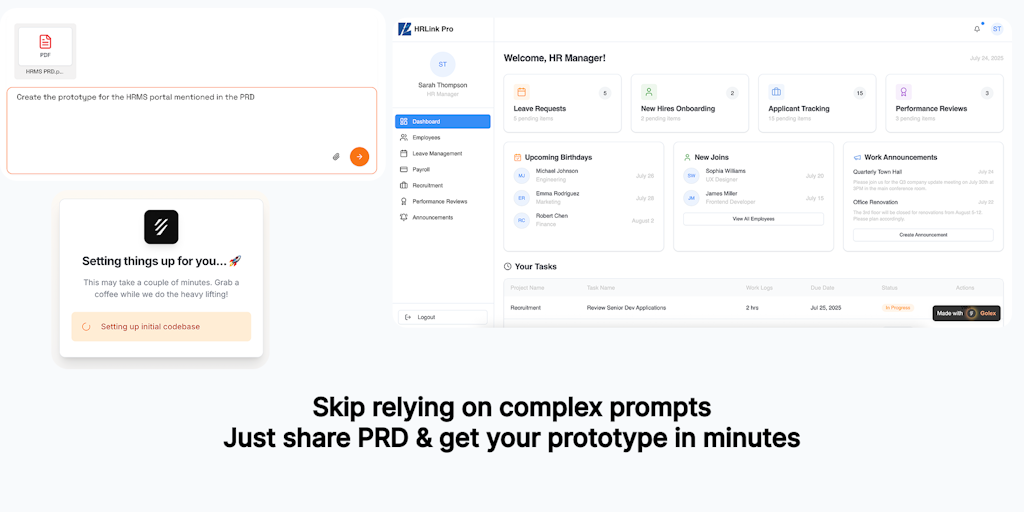 Golex AI turns your ideas, PRDs, or UI references into interactive website prototypes—no coding or complex prompts needed. Just share your vision, and Golex smartly creates the full user flow and desi