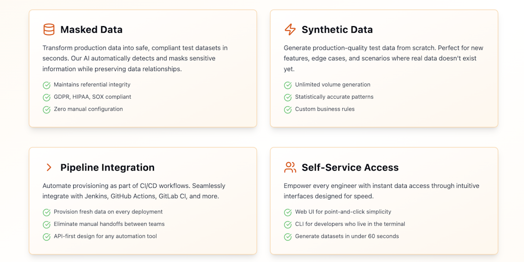 Test data bottlenecks kill velocity. Teams wait days for data refreshes or secretly use production. GoMask delivers instant, compliant test data through schema-aware masking and AI synthesis. Minutes,