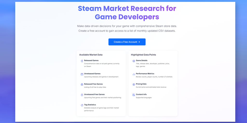Good Game Insights - Free CSV Datasets of scraped data from Steam | Product Hunt