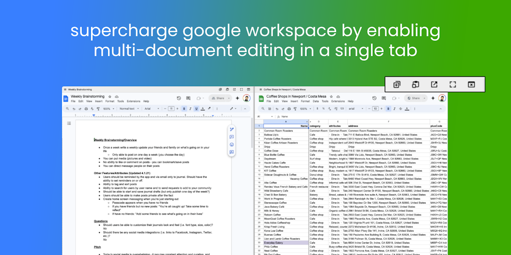 Open Google Docs, Sheets, and Slides side-by-side in a single Chrome tab. View the same document twice or different documents together, customize split sizes, and switch documents dynamically. Say goo