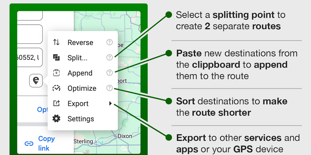 Painless long routes planning in Google Maps. Pefect for cyclists and motorbikers. - Extend routes beyond 10 points - Make mobile-friendly - Optimize for shorter travel - Export to GPX, KML, Apple Map