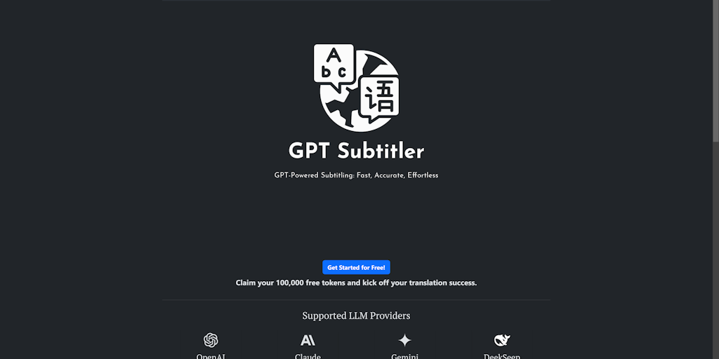 GPT Subtitler is a web app for fast, accurate subtitle translations using LLM like OpenAI, Claude, or Gemini. Translate subtitles or globalize your videos. Transform your workflow with efficiency and