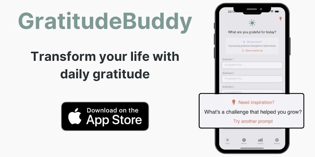 Transform your life with GratitudeBuddy, a beautiful gratitude journaling app for iOS, designed to boost happiness, reduce stress, and improve mental wellbeing through daily gratitude practice.
