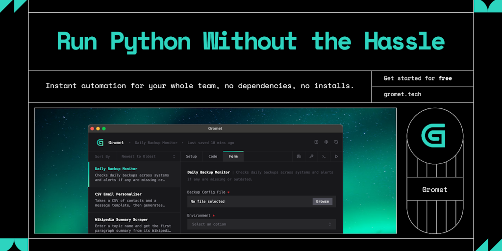 Gromet lets you turn Python scripts into one-click automations your team can run instantly. No installs, no dependencies, no terminal. Write once, share with a Gromet Vault key, and teammates can run