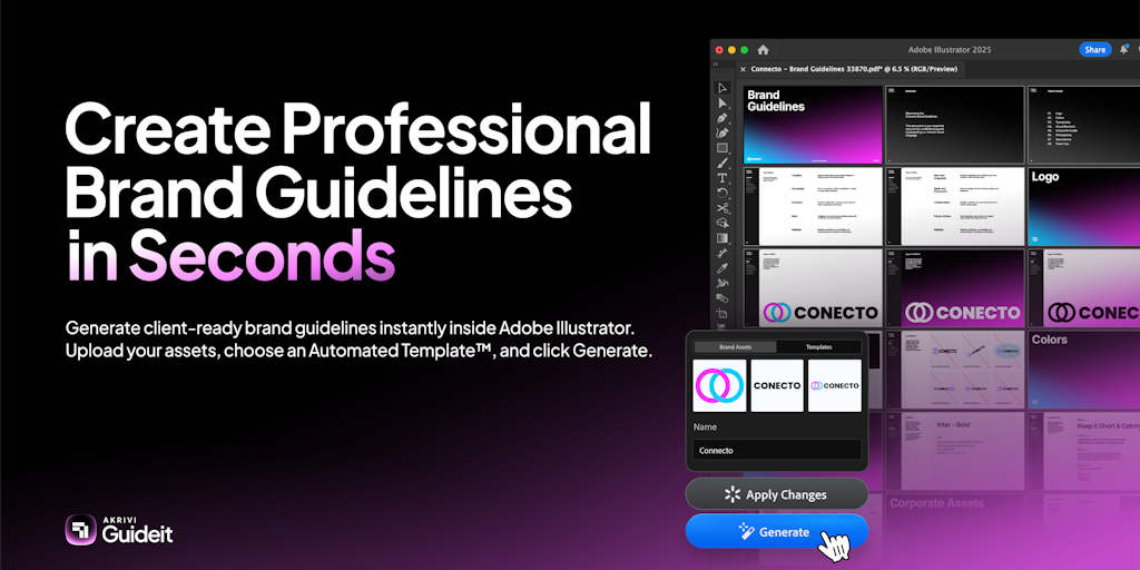 Guideit is a brand guidelines generator for Adobe Illustrator. Upload your logo, fonts, and colors, choose an Automated Template™ and click Generate. No more dragging logos, typing hex codes, or buyin