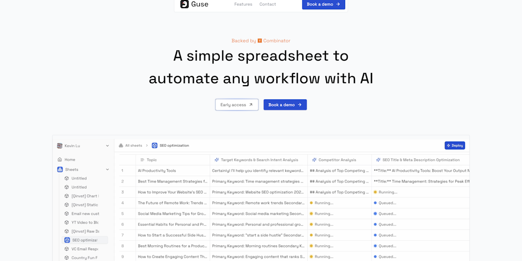 Guse is a simple spreadsheet that enables anyone to automate workflows with AI. Building a workflow is as easy as adding columns to a sheet and deploying just takes a single click. No new interfaces t