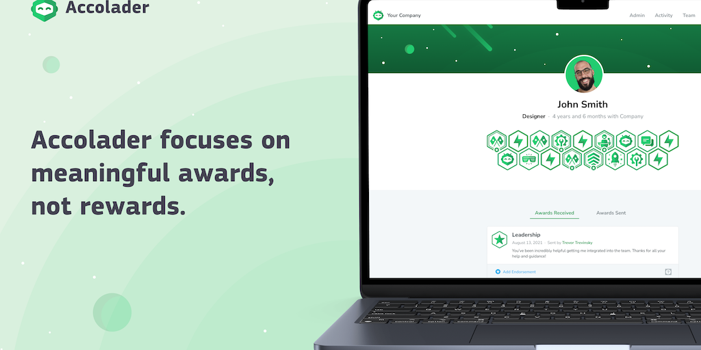 Accolader is a peer to peer employee award system. It is designed to be simple, customizable, and scalable. Rather than points or giftcards, Accoalder is based on what matters most - the award itself